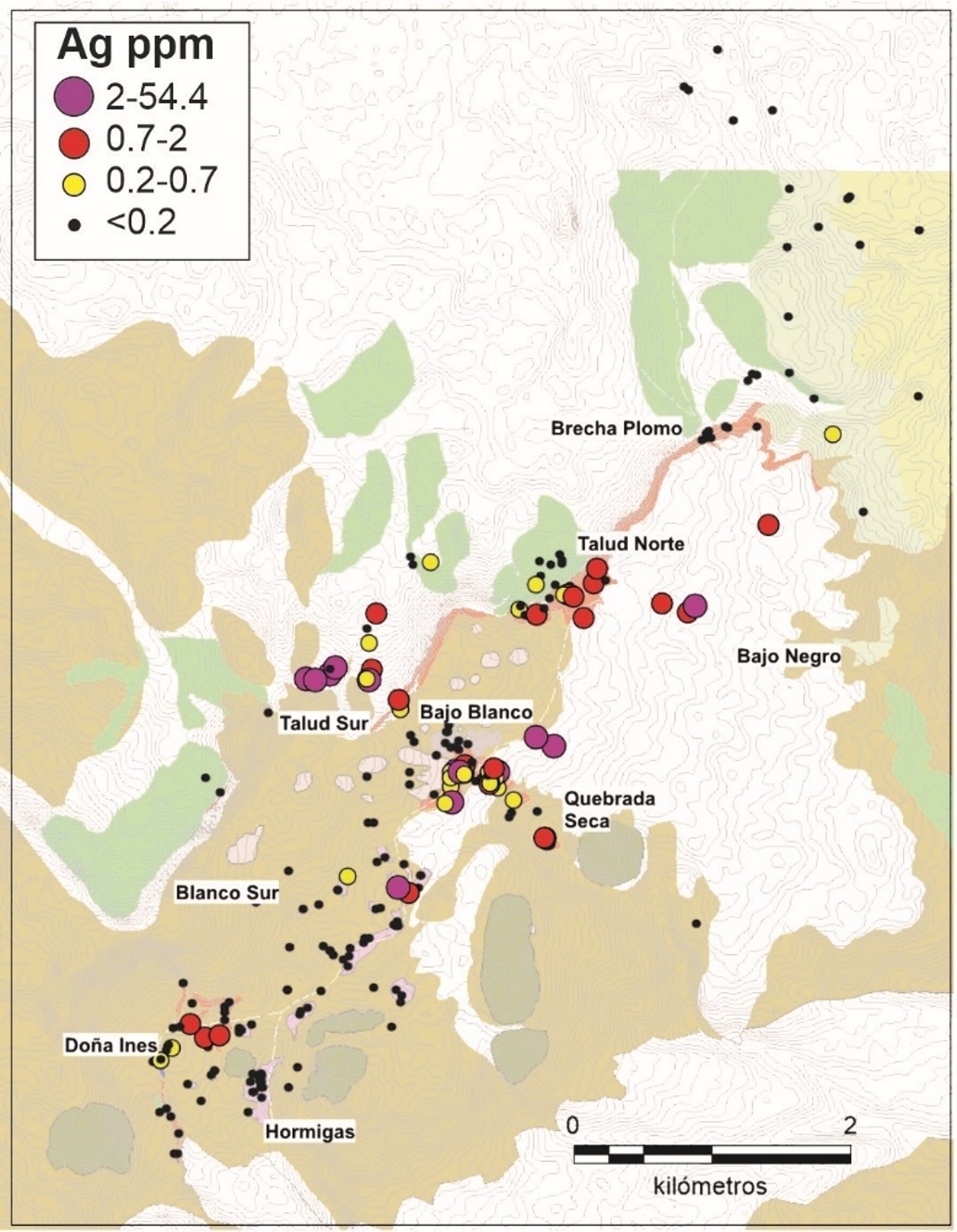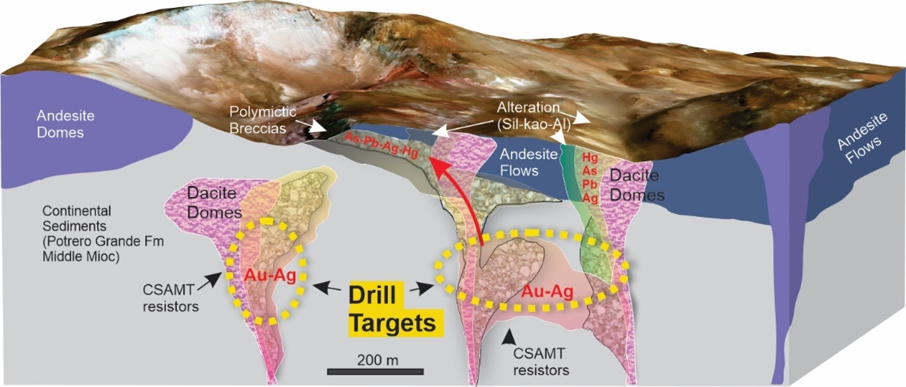 - Large areas of alteration and anomalous pathfinder geochemistry; Ag-As-Pb-Sb-Hg