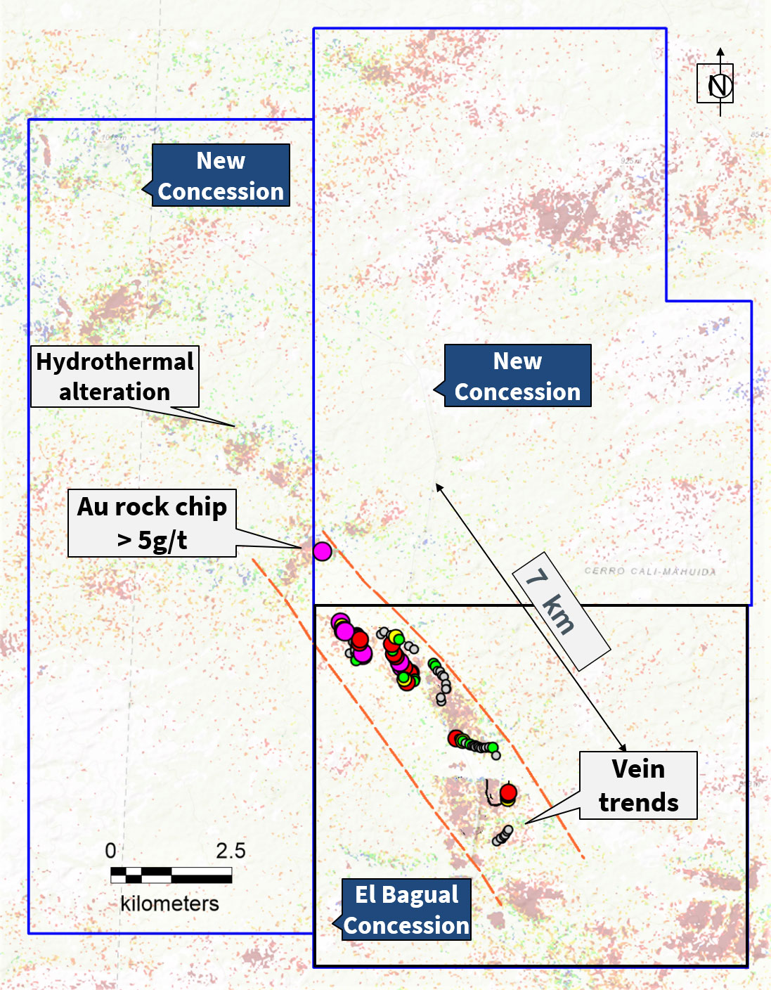 - High grade gold & silver vein system discovered by Rio de Oro S.A. in 2022 (up to 33 g/t Au and 1,786 g/t Ag in rock chips)
